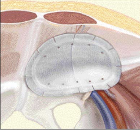 • Herstel met deels resorbeerbaar kunststof net, voor het buikvlies en achter de buikspieren geplaatst,-wat maakt dat het net niet in contact komt met de organen en dus ook quasi geen vergroeiingen in de buik geeft